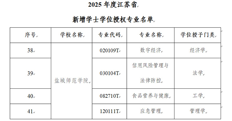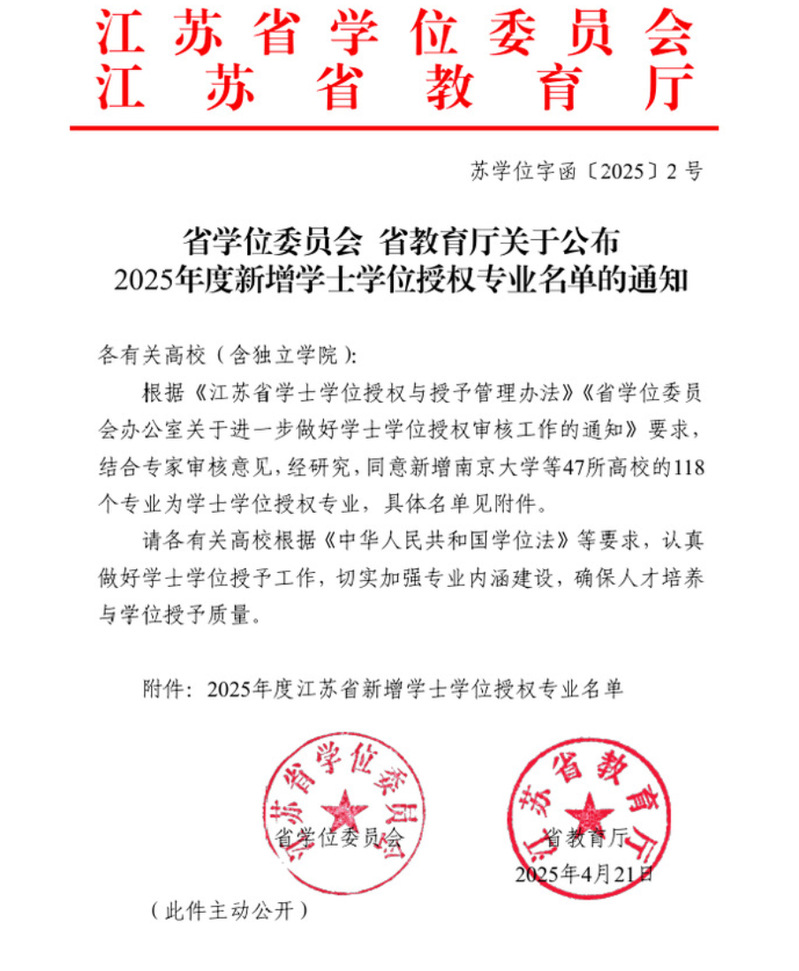 近日,江苏省学位委员会、江苏省教育厅发布《关于公布2025年度新增学士学位授权专业名单的通知》(苏学位字函〔2025〕2号),我校数字经济、信用风险管理与法律防控、食品营养与健康、应急管理4个专业顺利通过学士学位授权审核,获得学士学位授予权。
