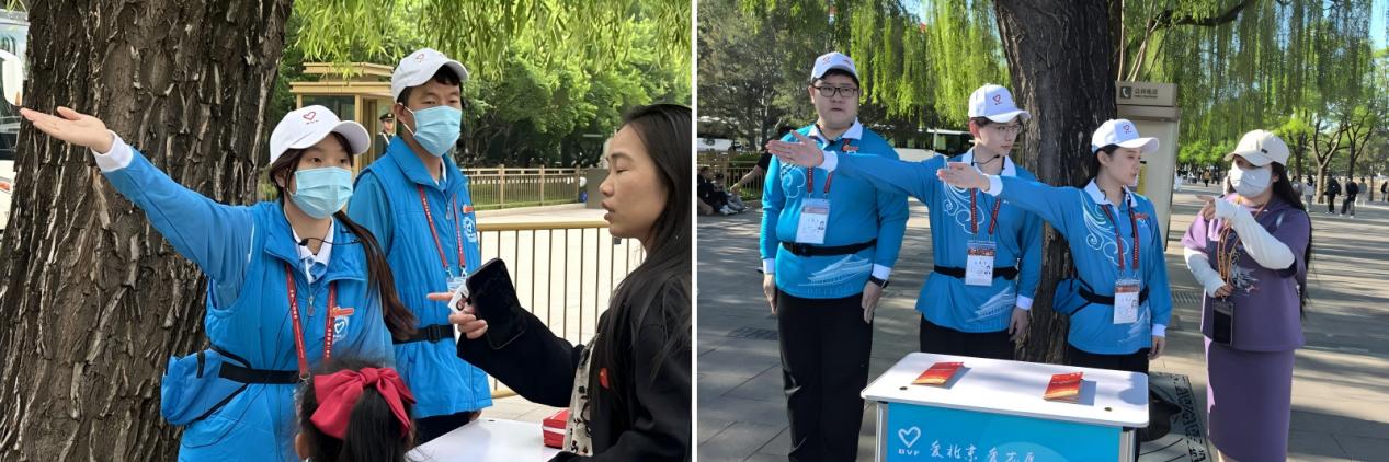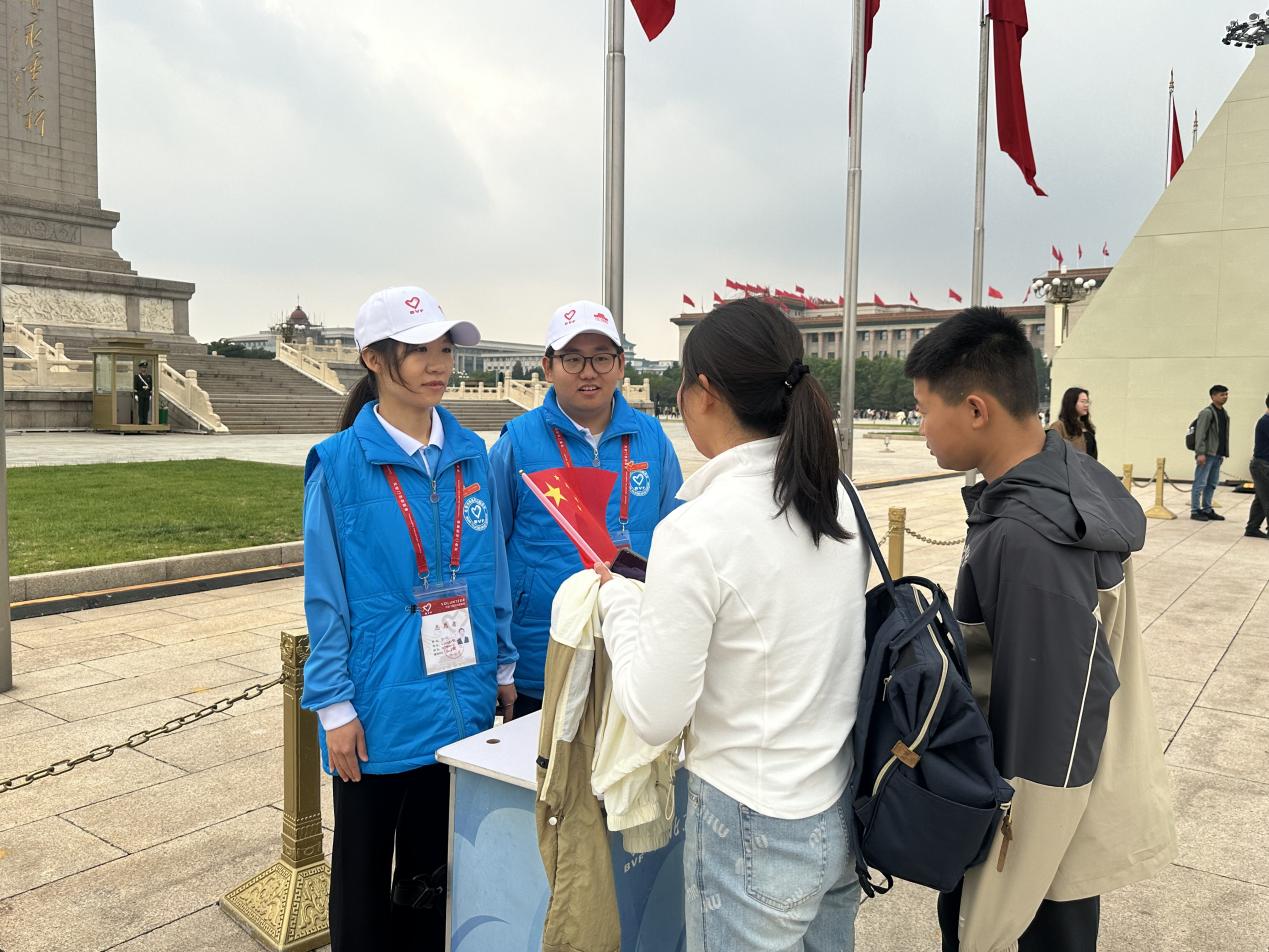 作为提升实践育人实效的重要项目平台,我校已连续两年组织开展“天安门广场上的大思政课”专项志愿服务。今年“五一”假期期间,学校选派12名志愿者连续赴天安门地区开展志愿服务,累计服务时长232小时,服务游客12000余人次。北邮学子以饱满的热情、专业的素养和细致的服务,充分彰显了当代大学生勇于担当、无私奉献的优秀品质,在天安门广场上绽放出青春奉献的绚丽光彩。“身着志愿蓝衫站在红旗之下,我在劳动服务中感受帮助他人的快乐,志愿者工作让我倍感光荣与幸福!”信息与通信工程学院硕士研究生孙嘉成服务后感慨道。