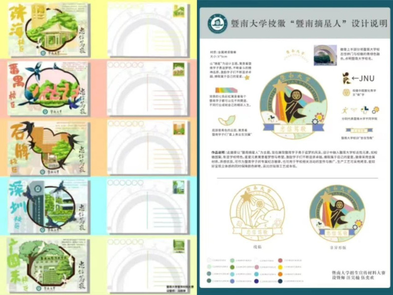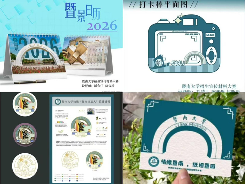 经过激烈角逐与专业评审,最终评选出一等奖1项、二等奖2项、三等奖3项、优胜奖4项。《暨景日历》凭借巧妙的创意与精湛的制作工艺摘得一等奖;《暨南摘星人》《五墨共绘暨南图》以独特的视角和艺术表达荣获二等奖;《光影暨迹》《暨梦杯语》《暨速狂奔》凭借对校园特色的生动诠释斩获三等奖;《猫屿织虹录》《鲤跃暨南门,笃志绽学魂》《纸间暨园》《暨南绘卷——知行合“五”》则以新颖的构思和丰富的细节获得优秀奖。这10个作品在本届本科招生宣传材料大赛脱颖而出,它们将成为学校招生宣传的新亮点,向更多人传递暨南大学的独特魅力。