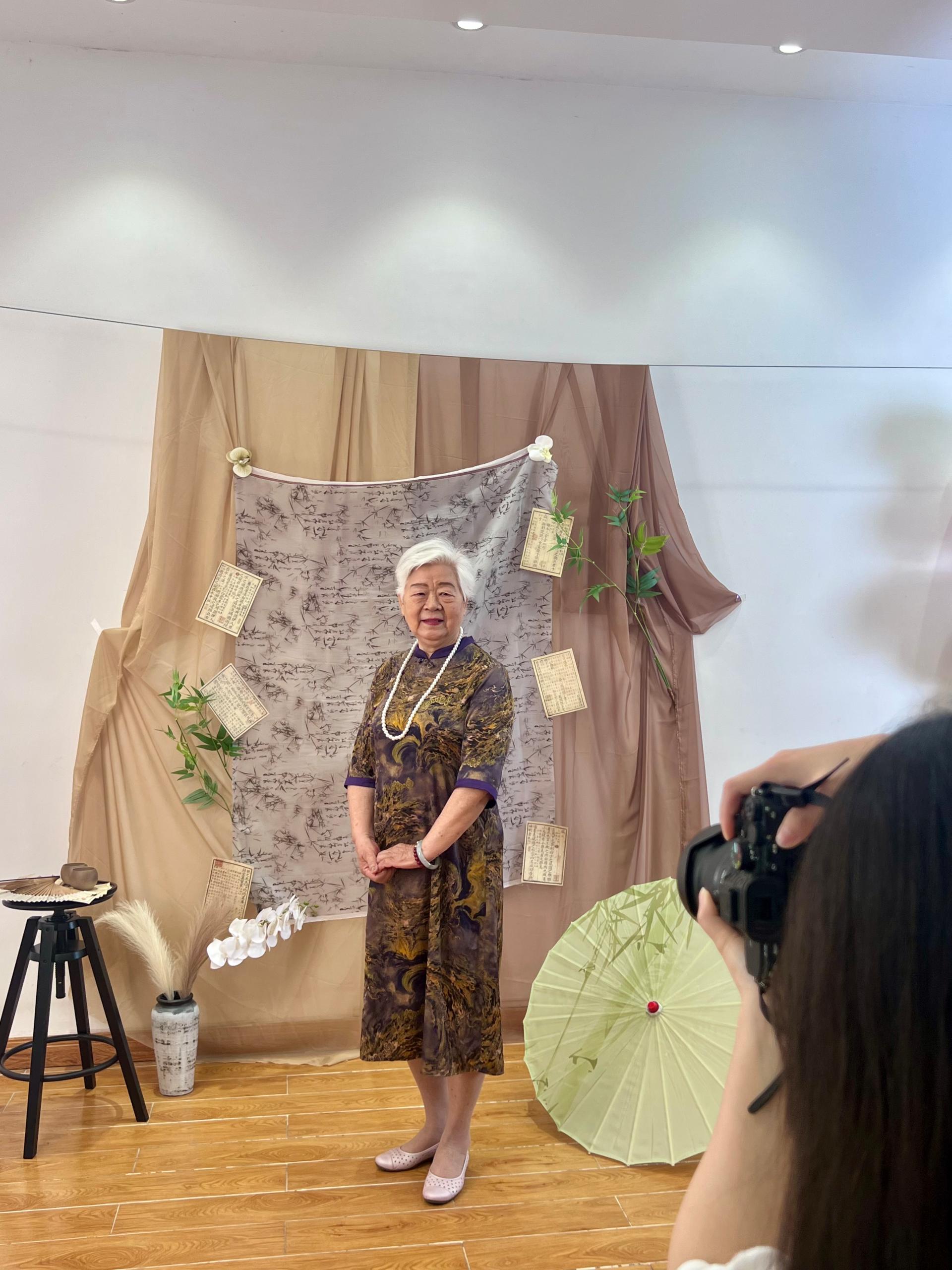 活动现场,五象养老服务中心洋溢着欢声笑语。学生志愿者们提前布置了简约而温馨的拍摄场景,准备了旗袍、唐装、鲜花、复古道具等多样化拍摄元素,并耐心为老人整理妆容、搭配服饰。摄影团队根据每位老人的性格与喜好设计拍摄风格,有的老人身着优雅长裙在花丛中展露笑颜,有的夫妻携手定格“岁月静好”的瞬间,还有“老闺蜜”们嬉笑着摆出俏皮姿势。镜头下,老人们从最初的拘谨到逐渐舒展笑颜,仿佛重返青春年华。
