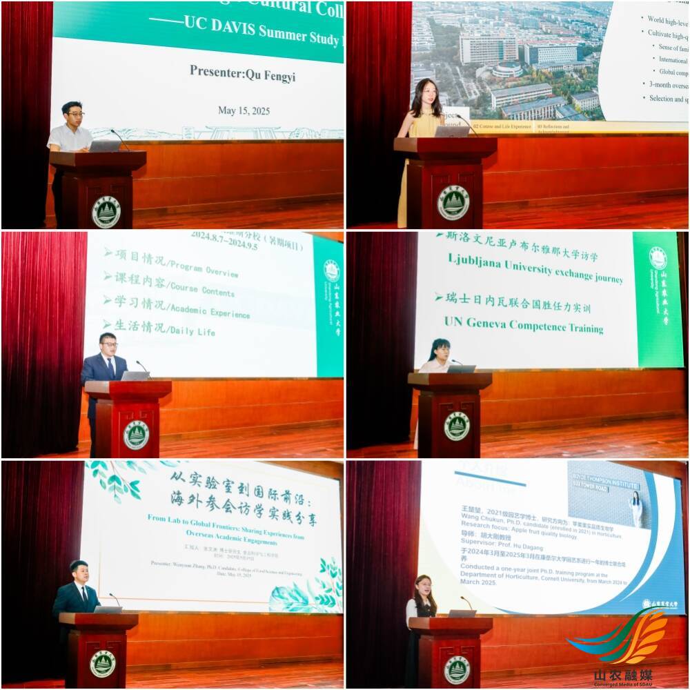 分享会上,来自农学院、齐鲁学堂、经管学院、食科学院与园艺学院的6名留学归来的优秀学子,用全英文的方式,从课程学习、科研经历、文化体验、生活经验及出国感悟等方面,分别介绍了各自在出国留学与实习期间的所见所闻、所思所学,让广大学子了解学习到了出国留学的宝贵经验,点燃了在场学生“逐梦海外”的兴趣,激发了大家对未来的憧憬和规划。