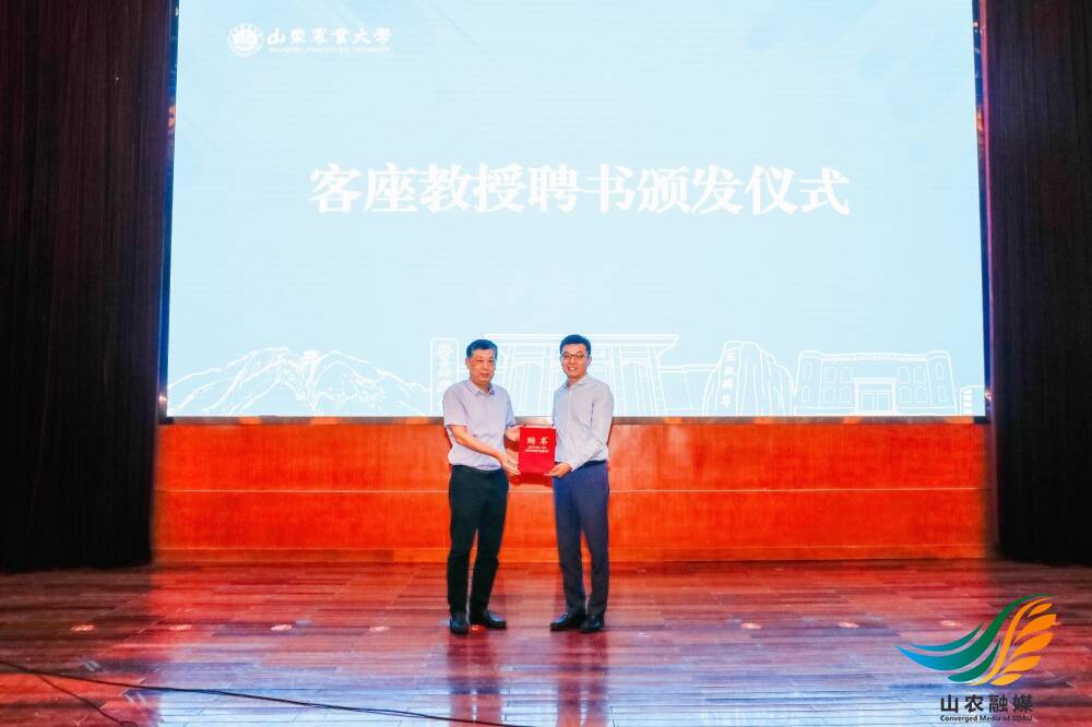 山农融媒5月15日讯5月15日,学校举行“逐梦海外·启航未来”优秀学子出国经验分享会。副校长林海出席活动,并为美国加州大学戴维斯分校孙华伟研究员颁发客座教授证书。