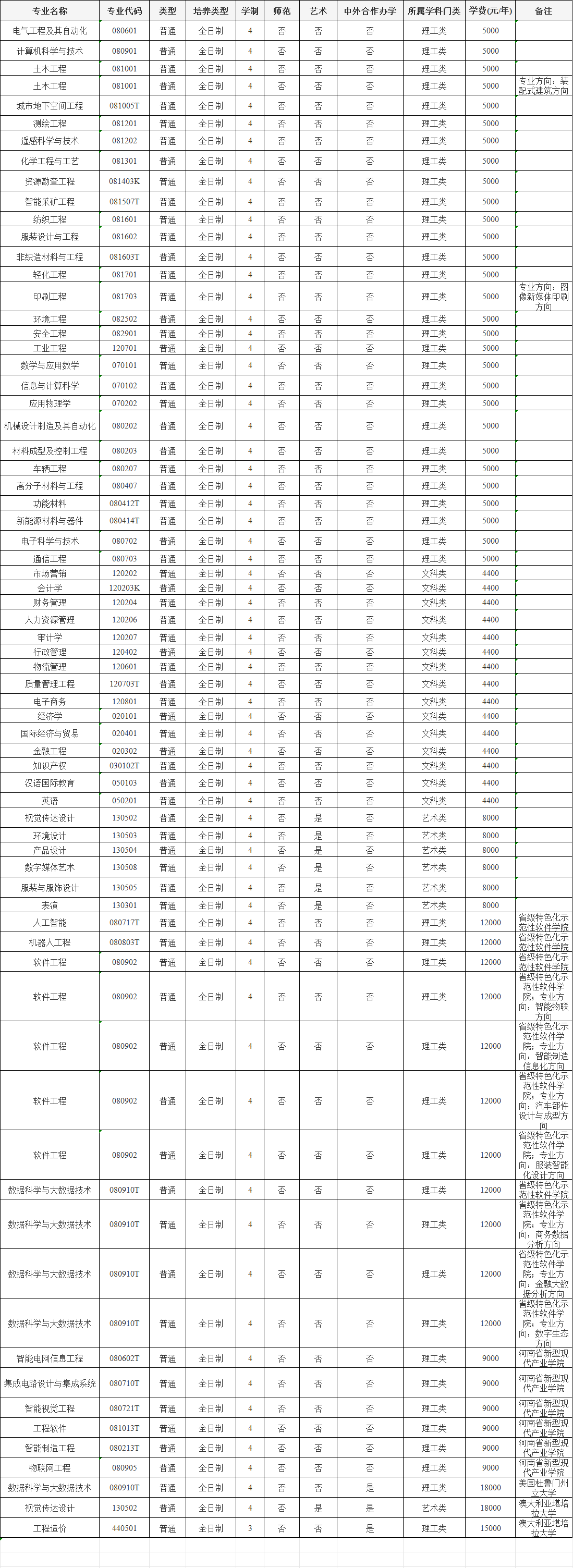 本科专业:艺术类8000元/年•生,理工类5000元/年•生,文史类4400元/年•生;其他专业:省级示范性软件学院专业12000元/年•生,河南省新型现代产业学院专业9000元/年•生;中外合作办学专业:视觉传达设计18000元/年•生,数据科学与大数据技术18000元/年•生,工程造价15000元/年•生。