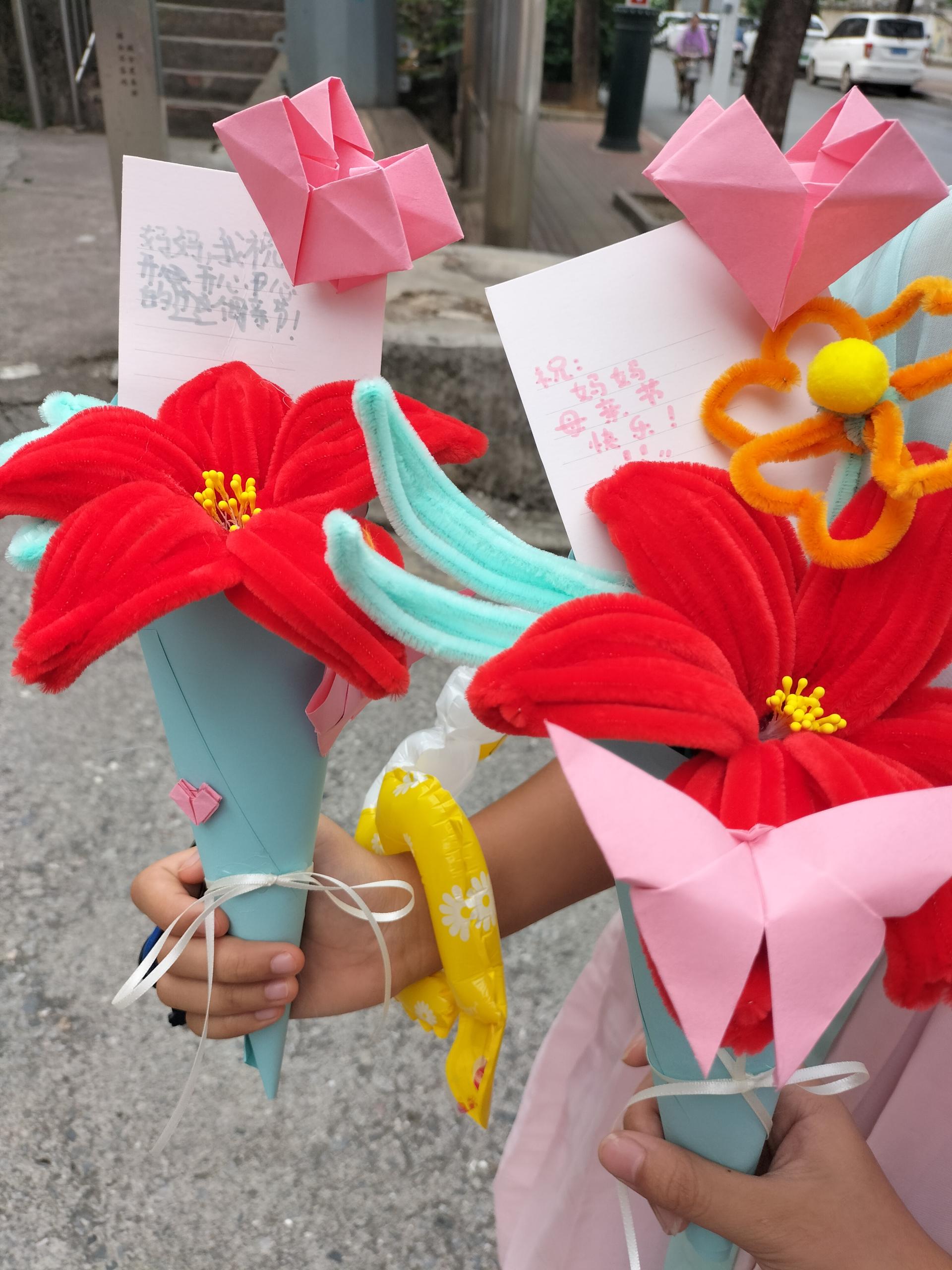 接着,青少年们在志愿者指导下编织扭扭棒与制作贺卡,一朵朵红色的小红花在手指尖翩翩起舞,紧接着精心挑选包装纸,将花朵包裹起来,最后粘贴上写满爱意和感激的话语贺卡。大家脸上洋溢着笑容,小心的捧着花束,仿佛在预演着待会见到妈妈的情景。