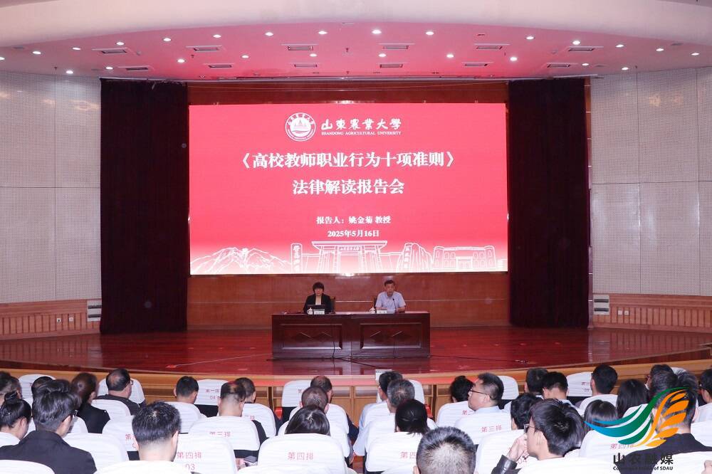 山农融媒5月16日讯5月16日,学校在文理大楼学术报告厅举办《新时代高校教师职业行为十项准则》法律解读报告会,深入贯彻落实习近平总书记关于教育的重要论述,进一步加强我校教师队伍师德师风建设。活动邀请北京外国语大学姚金菊教授作专题报告。副校长林海主持活动。