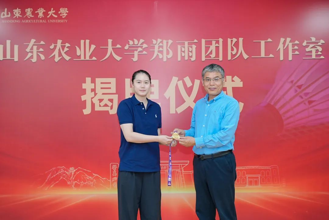 郑雨团队工作室揭牌仪式上,郑雨向学校捐赠了职业生涯中第一块国际大赛金牌——2021年苏迪曼杯中夺得的混合团体冠军奖牌。学校党委常委、副校长周玉玺代表学校接受奖牌。