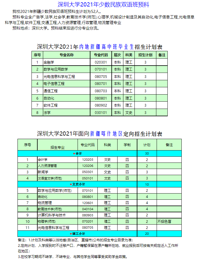 深圳大学2021年新疆其他类招生计划(含面向喀什定向招生,少数民族预科班,内地高中新疆班)