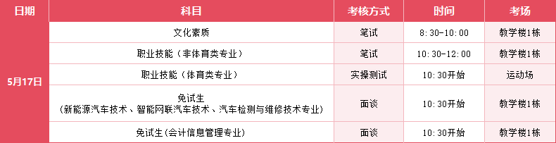 普通现代学徒制类型考试采用“文化素质+职业技能”考核方式,文化素质测试内容涵盖人文科学基本知识、职业道德基本要求、人际交往基本常识、汉语言写作基本能力等内容。“文化素质”考试采用笔试的方式,“职业技能”考核采用笔试或实操(体育类专业)等方式。其中体育类专业“职业技能”考核大纲详见附件,请体育类专业考生仔细阅读并提前准备钉鞋等考试用品。职业技能大赛获奖免试录取类型考生,直接采取专业考核认定(面谈)方式进行。