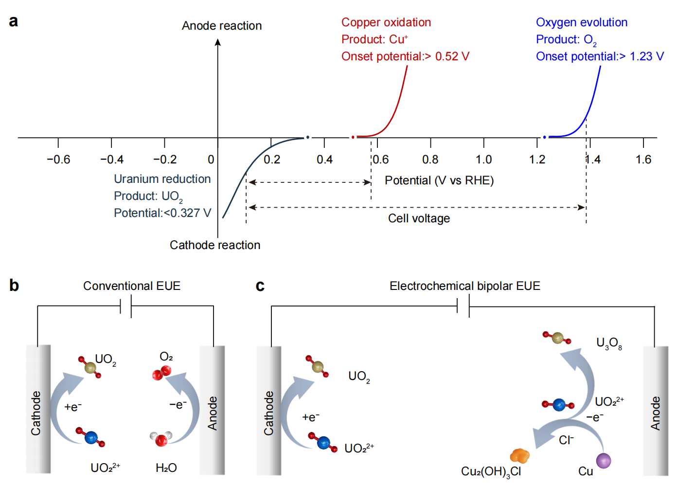 传统电化学提铀(EUE)和双极EUE方法的示意图。a, 不同阳极反应电位耦合阴极EUE体系;b, 传统EUE方法示意图;c, 双极EUE方法示意图。