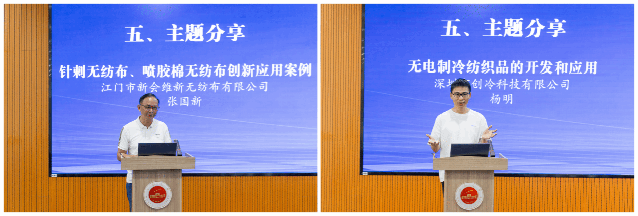在主题分享与交流环节,纺织科学与工程学院郭昌盛博士、甘锋博士,新会维新无纺布有限公司总经理、纺织科学与工程学院1993届校友张国新,深圳市创冷科技有限公司高级工程师杨明分享了行业前沿技术与创新实践成果。