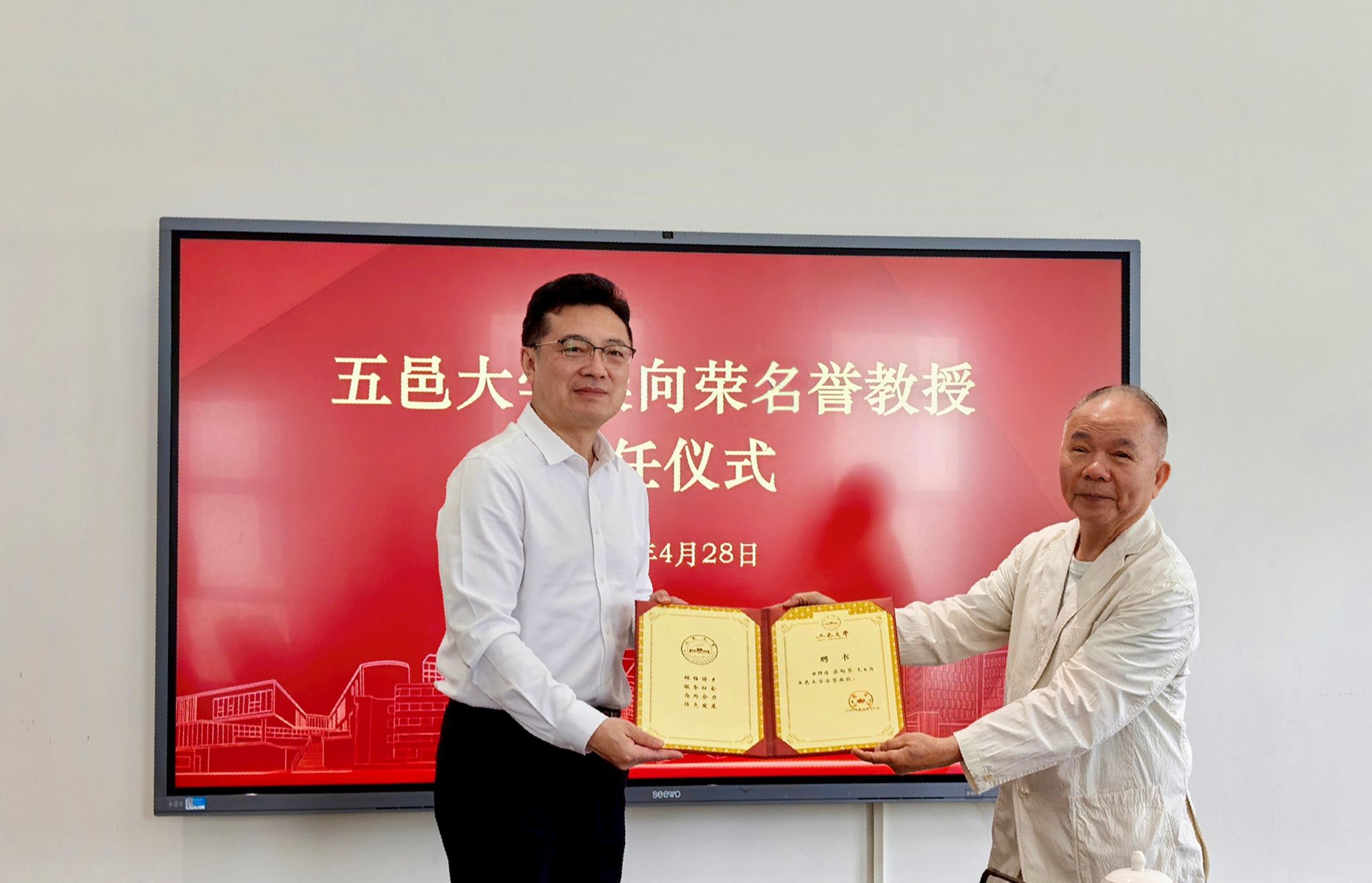 4月28日,爱国爱乡邑贤、香港向荣投资有限公司董事梁向荣先生到访五邑大学,就与学校共建国际化金融人才培养平台达成合作共识,携手服务国家金融战略实施和粤港澳大湾区高质量发展。校党委书记栾天罡代表学校向梁向荣先生颁发名誉教授聘书。校党委组织部、党委统战部、国际交流合作处、经济管理学院等相关单位负责人参加活动。