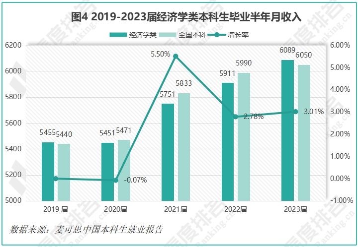 2019-2020年间,经济学类毕业生起薪基本与全国本科平均水平持平,但差距被缓慢拉大。直到2023届经济学类毕业生月收入才反超全国平均水平。