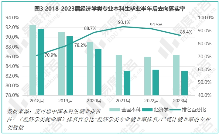 近年我国本科生就业率大幅下滑,许多专业的毕业生面临毕业即失业的问题。经济学类专业毕业生也位列其中。2018-2023年间,经济学类毕业生就业率从91.7%下滑至83.1%,降幅达8.6个百分点,明显高于全国本科整体就业率的下滑幅度。大环境下传统金融、贸易等行业吸纳能力下降或许也是因素之一,