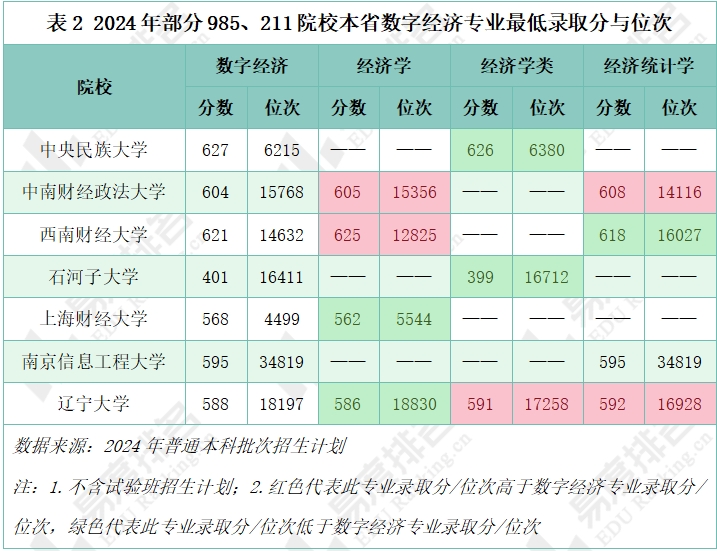 下表展示了2024年部分985、211院校的数字经济专业作为交叉性质前沿专业与其他经济专业在本省的最低录取分数和位次对比。