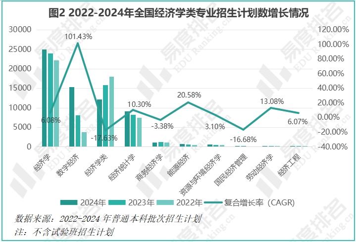 从2022-2024年的招生数据来看,各院校主要分为专业招生和专业类招生两种方式(试验班除外)。其中数字经济专业表现最为亮眼,作为经济学类中最年轻的专业方向,课程设置中普遍融合了经济学理论、大数据分析、区块链技术等跨学科内容。该专业招生人数从2022年的3千多人快速增长至2024年的1.5万多人,三年复合增长率约为101.43%,展现强劲的发展势头。同时,经济学、经济统计学等传统专业也保持稳定的持续增长。