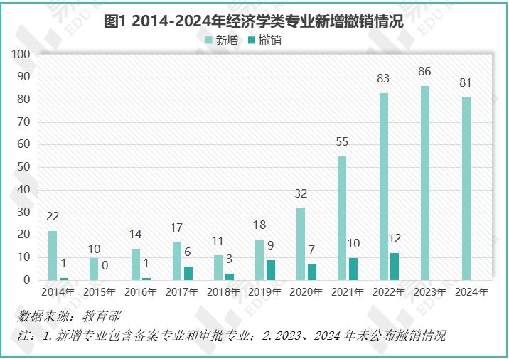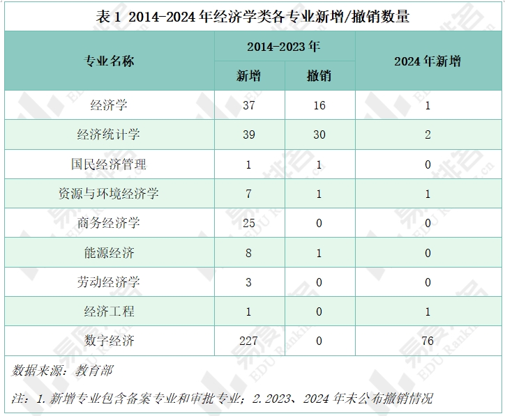 从教育部公布的数据来看,自2020年起经济学类专业新增速度加快,十年间新开设数量高达429个。数字经济为2018年新增设专业,此间新增227个专业点,仅2024年就新增76个,呈现了爆发式增长态势,占经济学类专业新增总量的94%,而传统经济学和经济统计学专业数量则在2019-2023年大幅调整,学科发展正在向数字经济和应用型专业转型。