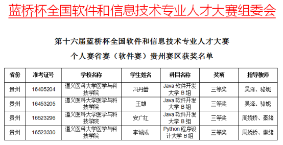 2025年4月30日,第十六届蓝桥杯全国软件和信息技术专业人才大赛省赛圆满结束。在智能信息工程学院吴泽、周娇娇、骆妮和秦绪4名老师指导下,我院医学信息工程专业冯丹蕾、王雄同学及信息与计算科学专业安广红同学获得本次大赛省赛Java软件开发大学B组三等奖,数据科学与大数据技术专业李诚成获得Python程序设计大学B组三等奖。
