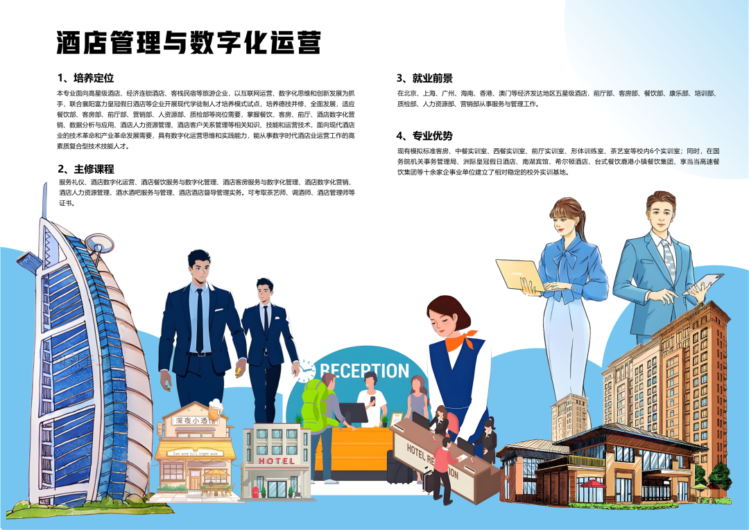 培养目标本专业面向高星级酒店、经济连锁酒店、客栈民宿等旅游企业,以互联网运营、数字化思维和创新发展为抓手,联合襄阳富力皇冠假日酒店等企业开展现代学徒制人才培养模式试点,培养思想政治坚定、德技并修、全面发展,适应餐饮部、客房部、前厅部、营销部、人力资源部、培训部、质检部等岗位需要,具备爱岗敬业、吃苦耐劳、善于沟通、精于合作的良好职业素质,掌握餐饮、客房、前厅、酒店数字化营销、数据分析与应用、酒店人力资源管理、酒店客户关系管理等相关知识、技能和运营技术,面向现代酒店业的技术革命和产业革命发展需要,具有数字化运营思维和实践能力,能从事数字时代酒店业运营工作的高素质复合型技术技能人才。