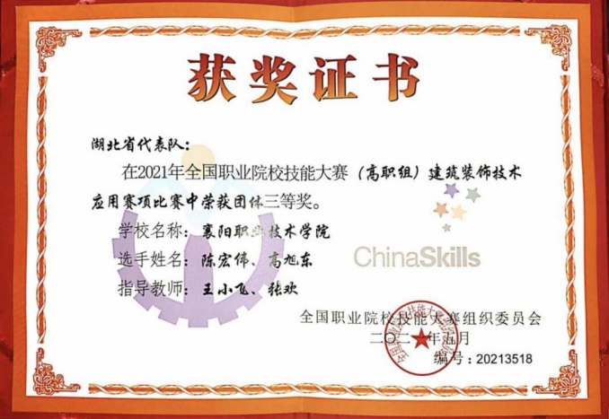 2021 | 全国职业院校技能大赛高职组建筑装饰技术应用赛项 | 团体三等奖 | |