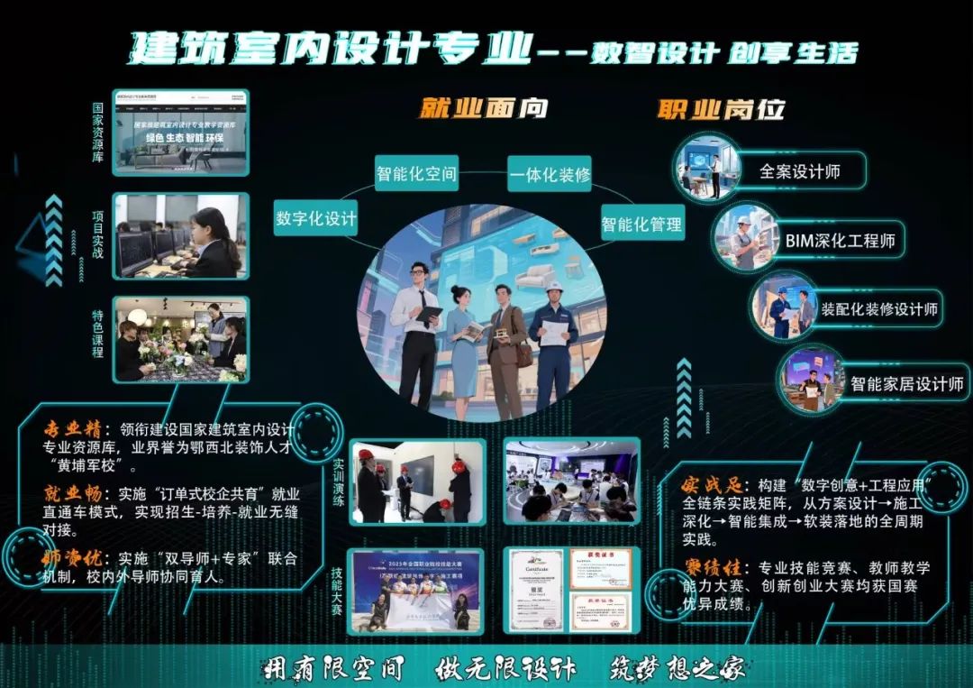 核心课程:建筑CAD、室内设计基础、住宅空间设计、定制家具设计、公共空间设计、VR设计及应用、软装设计与搭配、手绘表现技法、建筑装饰施工技术、BIM建模技术、室内施工图绘制与深化设计等。