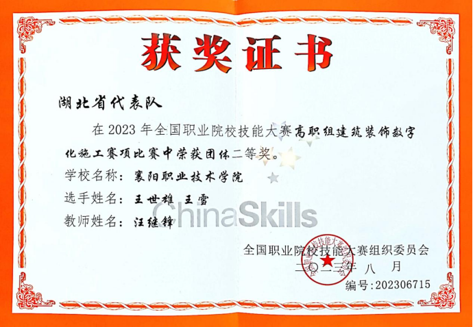 2023 | 全国职业院校技能大赛高职组建筑装饰数字化施工赛项(师生同赛) | 团体二等奖 | |