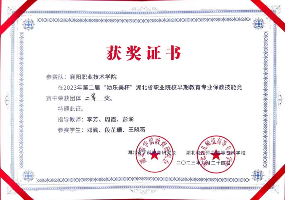 2023年邓勤、段芷珊、王晓薇参加湖北省职业院校早期教育专业保教技能竞赛团体二等奖。