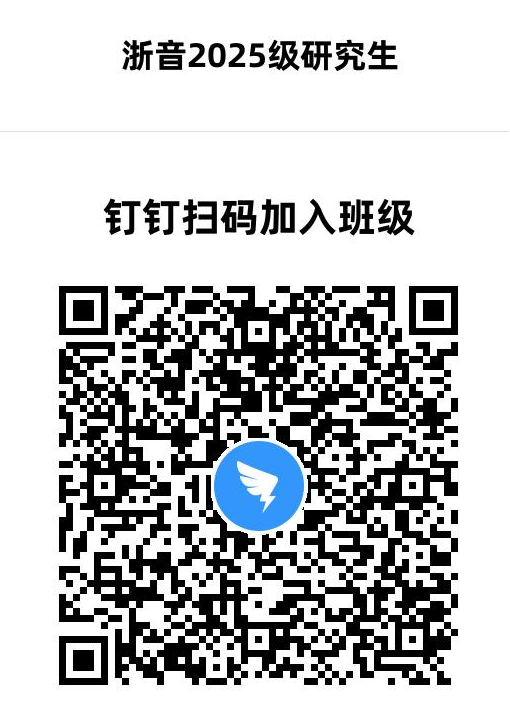 1.请拟录取新生在钉钉软件中搜索群号LKBF3599或扫描下方二维码,加入“浙音2025级研究生”群,在群文件下载调档函并打印(必须彩色打印,否则无效),自行交至档案所在单位进行调档工作。申请加群请务必填写报考院(系)+真实姓名,未备注真实姓名的申请均不受理。