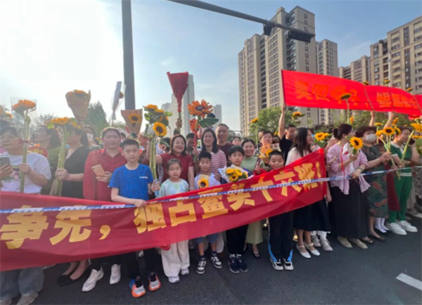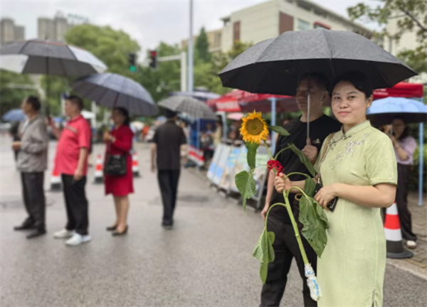 合肥市五十中学西校教育集团贵池路校区,家人手持自家种的向日葵送考。