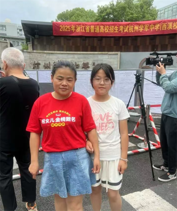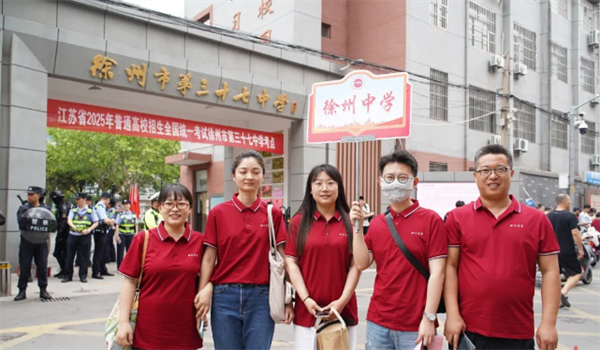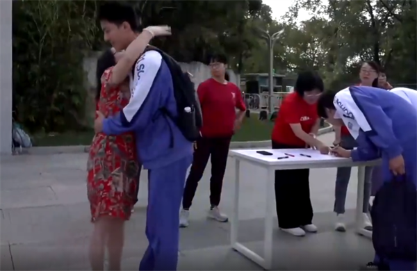 妈妈穿着“祝女儿金榜题名,旗开得胜”的红色t恤,来送考。