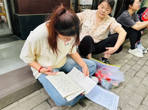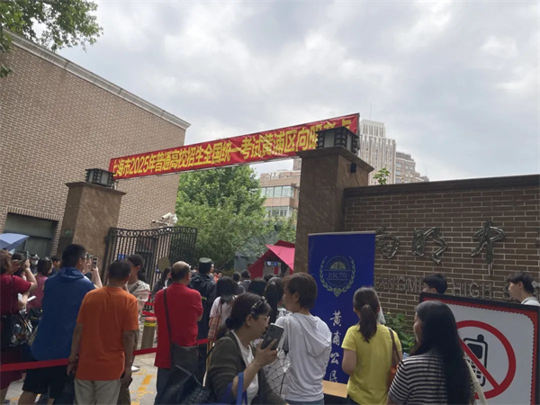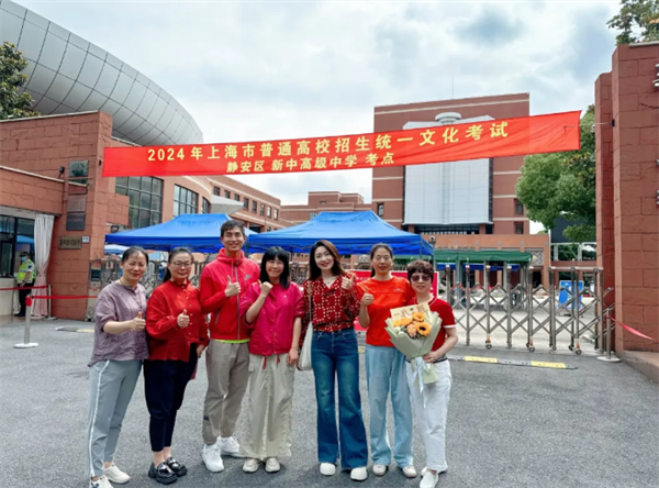 上海市彭浦中学的老师们在上海市新中高级中学考点外为考生护航。