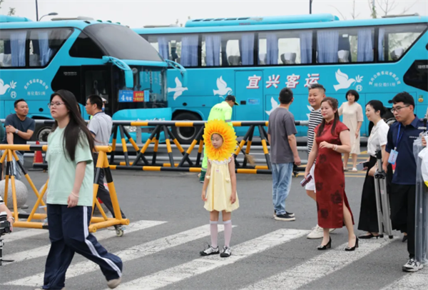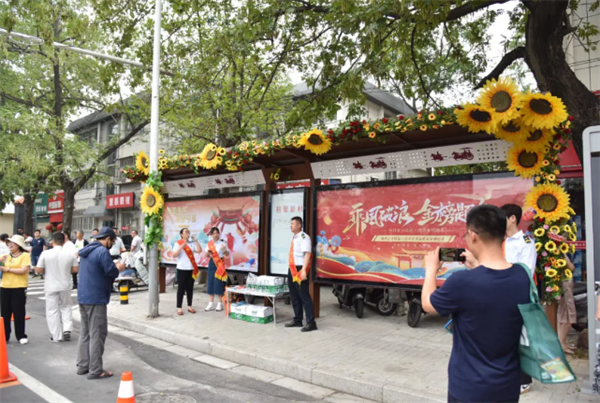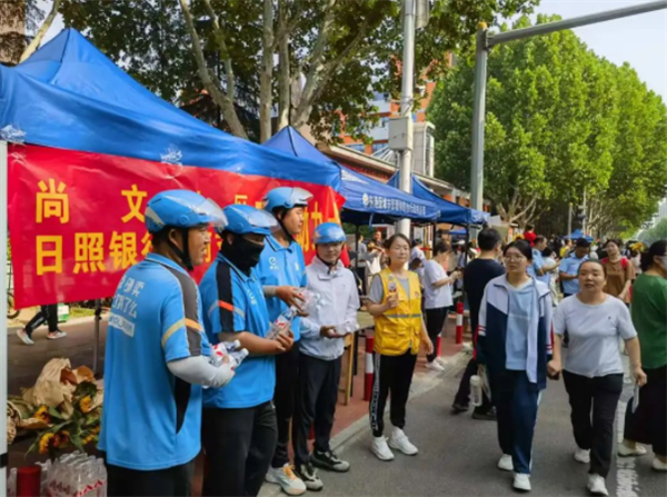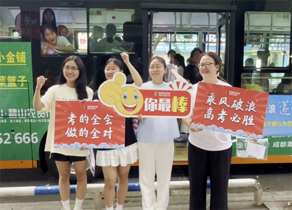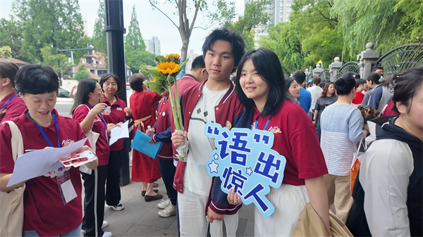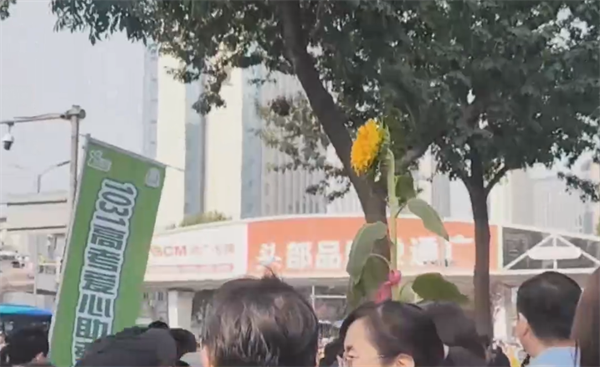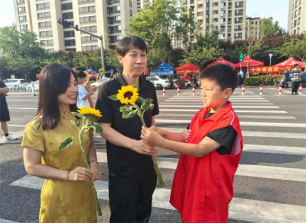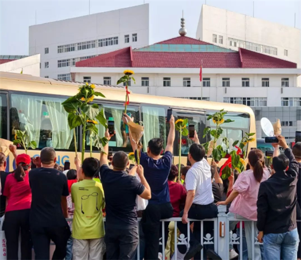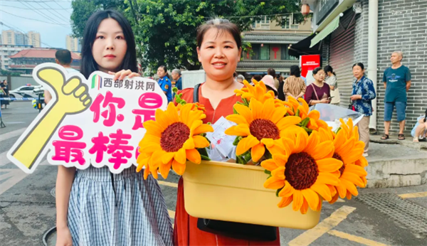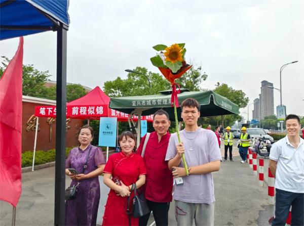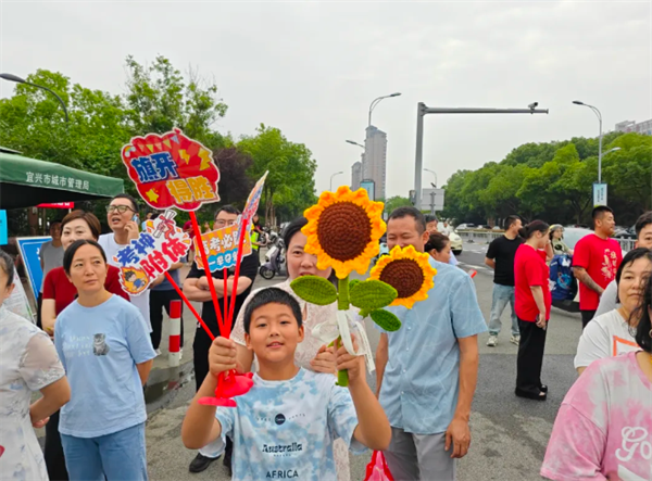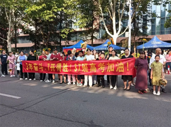 老师们手持鲜艳的向日葵,满怀热忱地为考生助力加油。