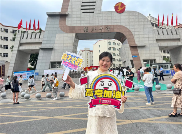工作人员在校门口提醒考生携带好身份证、准考证等必备证件和用品。