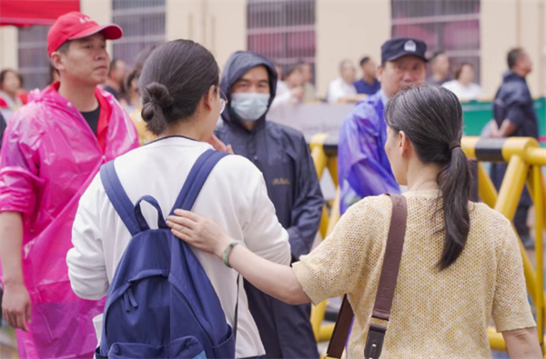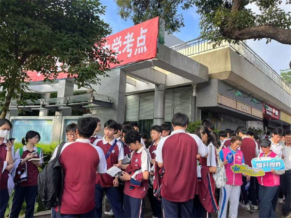 老师正站在考场外,悉心送考,为学生们加油鼓劲。