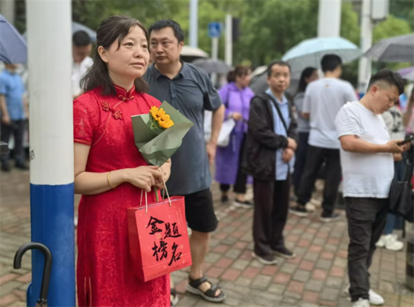 考点外,家长手中拿着象征“一举夺魁”的向日葵等候。