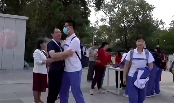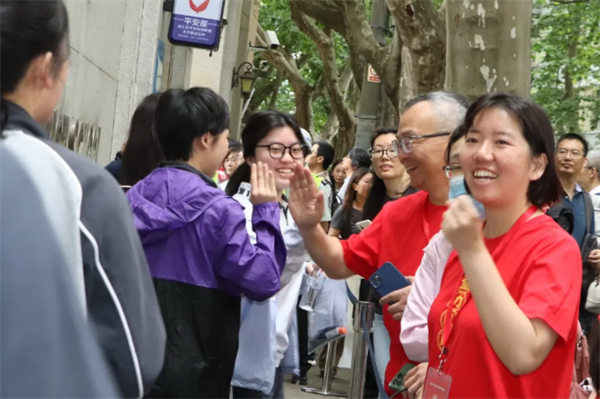 上海市第五十四中学考点,送考老师们笑意盈盈地与考生们击掌、握手、拥抱,给予考生们能量。