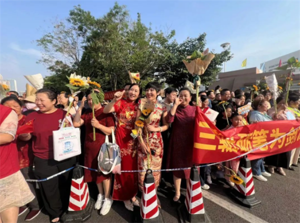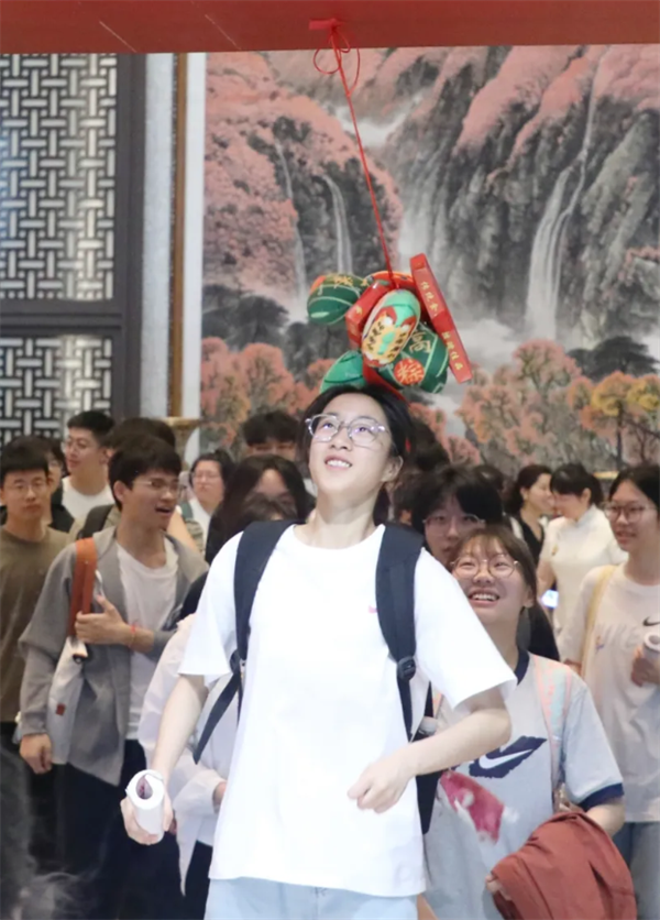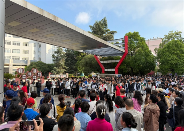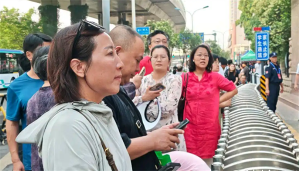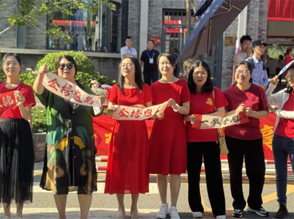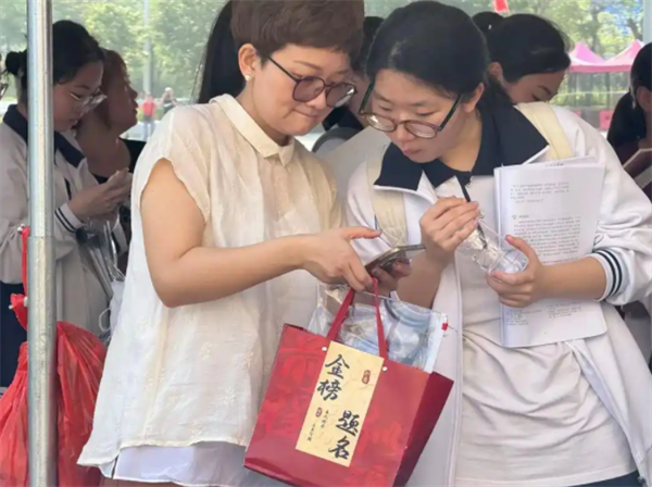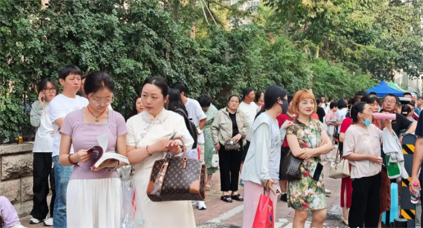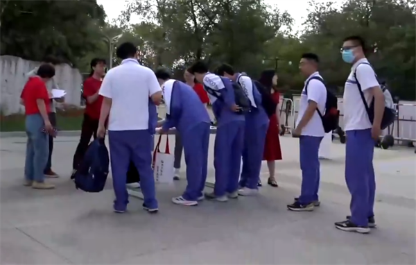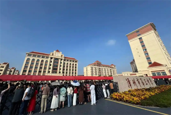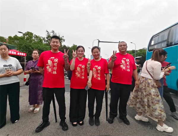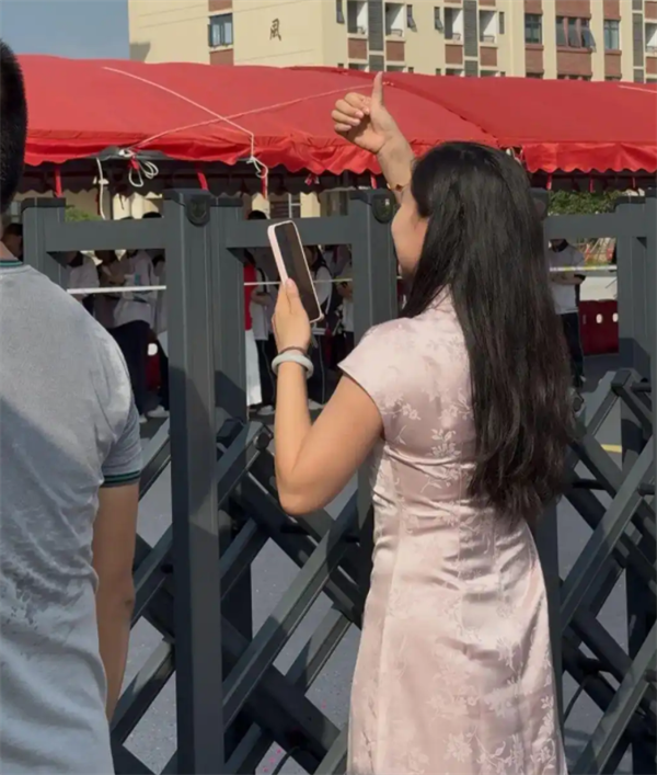 家长们身着典雅旗袍,满脸笑意地鼓励着即将步入考场的考生。