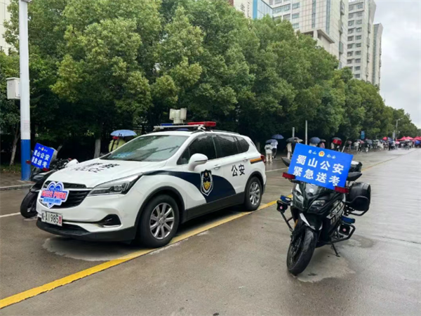 合肥八中考点外,蜀山公安提前布置了紧急送考摩托车。