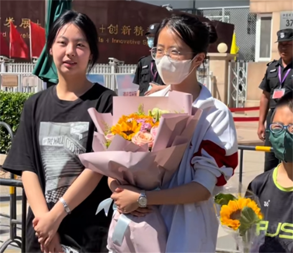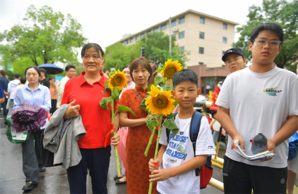 山东考点外,家长手举向日葵,寓意“一举夺魁”。