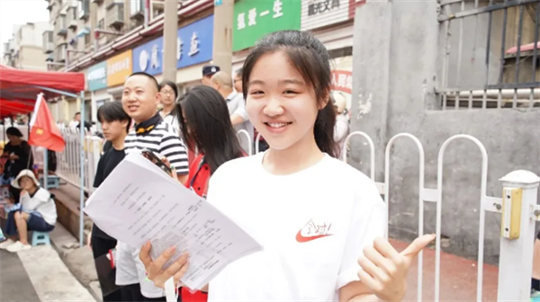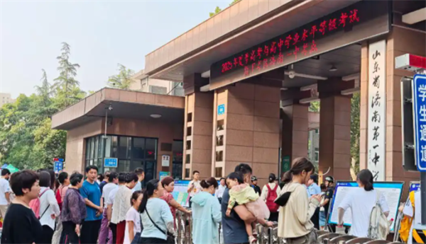 济南一中考点外,家长暖心送考为孩子加油助威。