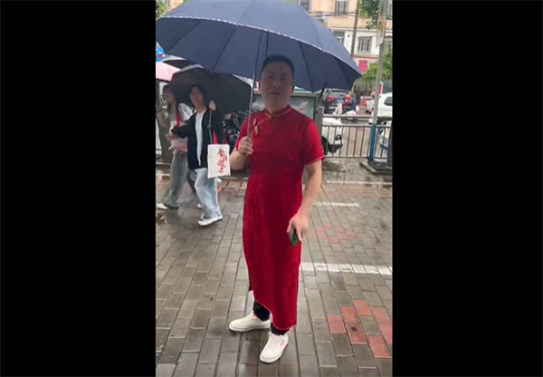 巢湖一中考点,一位爸爸身穿大红旗袍,给孩子高考加油。