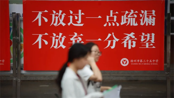 高考生正奔赴考场,家长身着红衣,助力加油。