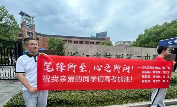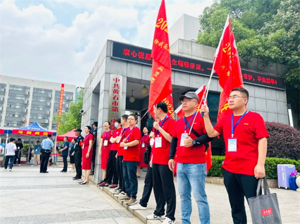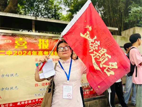 老师带着签有全班同学名字的旗帜,来到黄石二中考点给学生送考。