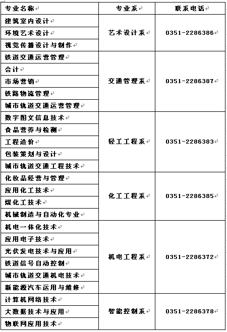 各位考生: 根据《山西省招生考试管理中心关于做好2020年高职院校单独招生考试工作的通知》(晋招考高〔2019〕21号)等文件相关要求及当前疫情防控要求 ,我院2020年单独招生采取网络远程考核方式进行,现将具体事项通知如下: 一、模拟测试时间:6月22日。 正式考核时间:6月23日——25日 二、考核方式:网络远程测试。 三、考前准备: 1.考核前考生须准备以下材料,并拍照以压缩包形式发送到各专业指定邮箱(压缩包以“姓名+专业”命名),原件在开学报到时交回学院。 ①《山西铁道职业技术学院2020年单独招生考生报考登记表》(请从学院官网www.sxtdzy.cn下载,由毕业学校填写成绩并签字盖章)。 ②高级中等教育毕业证书(应届生提供在校证明)。 ③本人二代身份证原件。 ④符合普通高考加分条件的提供相关材料原件。 2、考生须按照报考专业对应专业系的要求,加入指定QQ群,各专业系会在QQ群进行考前培训,通知考核相关事宜及注意事项。 3、考生须提前下载好“腾讯会议”APP并以本人姓名注册登录。 4、考生要根据各专业系要求准备好考核所用的电脑或手机等视频设备,并测试设备运行状况,确保设备运行正常。 5、考生要选择光线明亮、环境安静的场所参加考核,衣着要整齐得体。 6、考生若没有收到对应专业系的通知,要及时与专业对应的专业系联系。(见附件:各专业联系方式) 四、考核 1、考生要严格按照各专业系考核小组规定时间参加考核。 2、考生在进入腾讯会议后要先出示身份证原件供考官核验。 3、考生要根据现场抽取试题进行回答,回答时间为5——8分钟,考核过程中不得随意离开。 4、考核结束要离开考场,不得在QQ群内泄露考核试题及内容。 相关信息请关注我院官网(www.sxtdzy.cn)或“sxtdzyzsb”微信公众号。 山西铁道职业技术学院 二〇二〇年六月十九日 山西铁道职业技术学院2020年单独招生考核各专业系联系方式
