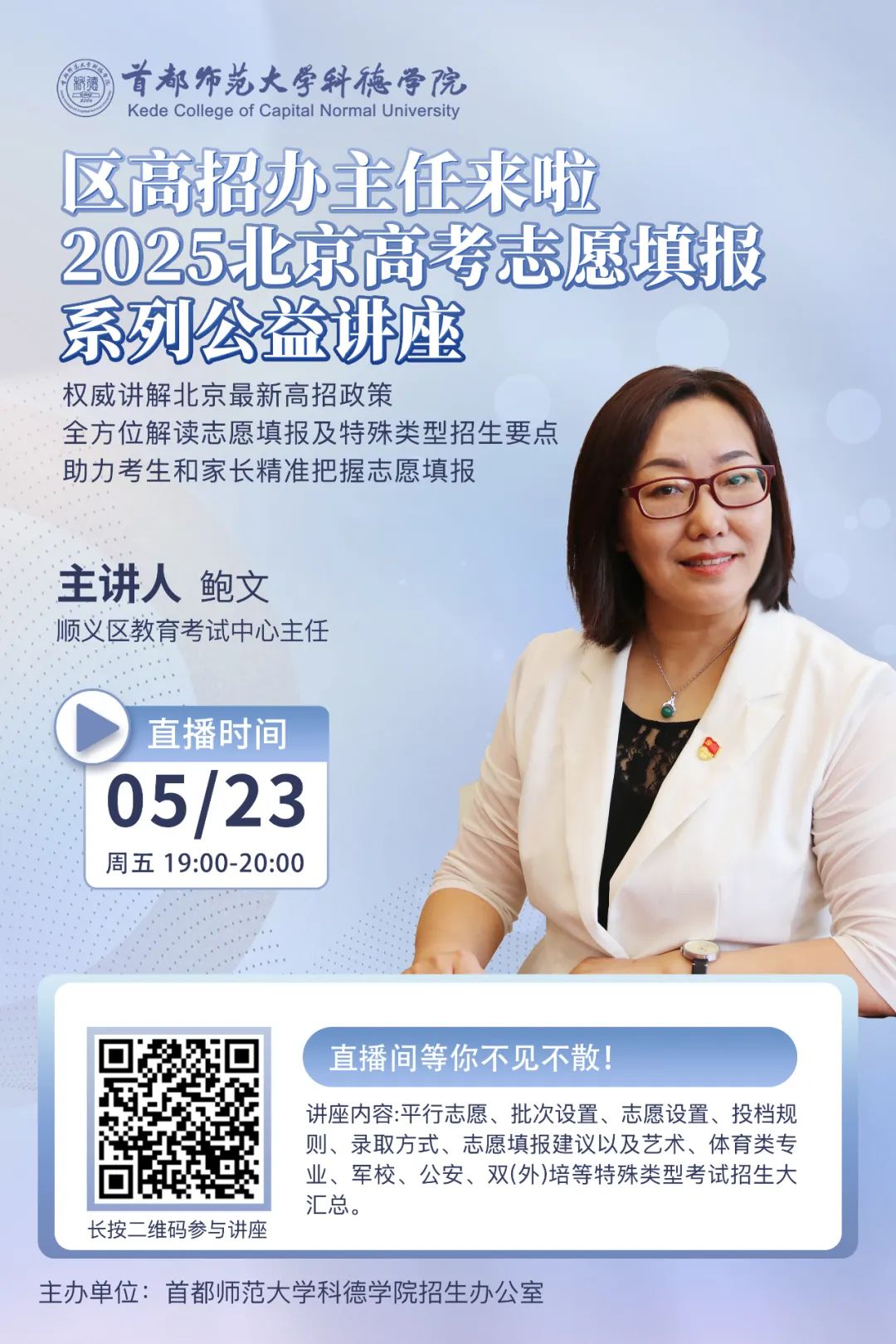 顺义区教育考试中心主任鲍文,将于5月23日(本周五)19:00做客首都师范大学科德学院直播间,为考生和家长解读最新高招政策。扫码预约收看。
