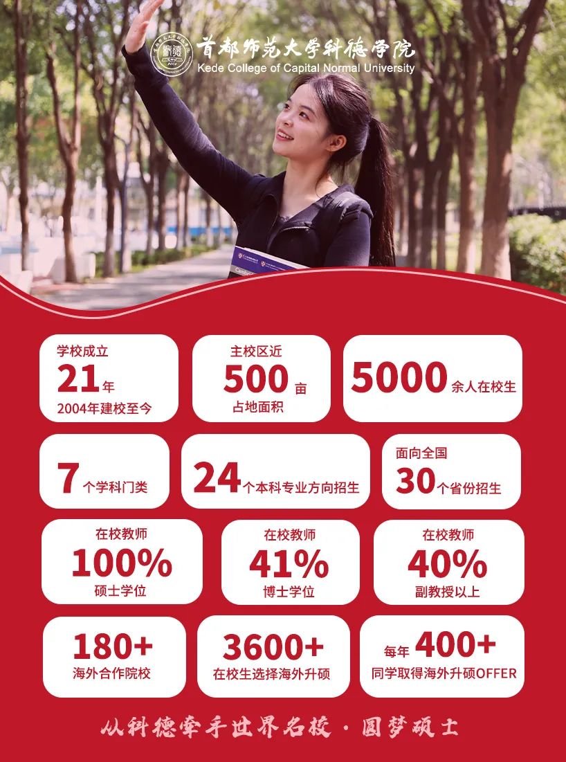 如何避免浪费分数?如何科学填报高考志愿?清晰了解高招录取规则网上信息海量复杂,无从下手。不用担心!来听讲座吧!权威解读,不容错过!主办方:首都师范大学科德学院简介首都师范大学科德学院是经教育部批准实施本科层次学历教育的全日制普通高等学校(独立学院)。是一所以文、教育、经、管、工、理、艺等学科门类为主的综合性大学。学校成立于 2004 年,是北京市首家独立学院,办学21年,目前在校生5000余人。学校秉承“高端化、全球化、个性化”的办学理念,致力于应用型创新人才培养,在新文科、新商科、新工科背景下,艺术与科技、经济与管理、教育与人工智能等多学科交叉融合发展,形成了与产业紧密融合的专业群,凸显多门类学科优势。基于人工智能、互联网和大数据的快速发展,面向数字产业和文化创意产业前沿,培养适应国家经济社会发展,具有国际视野和创新精神、较强实践能力的技术、艺术与网络视听融合发展的应用型人才。