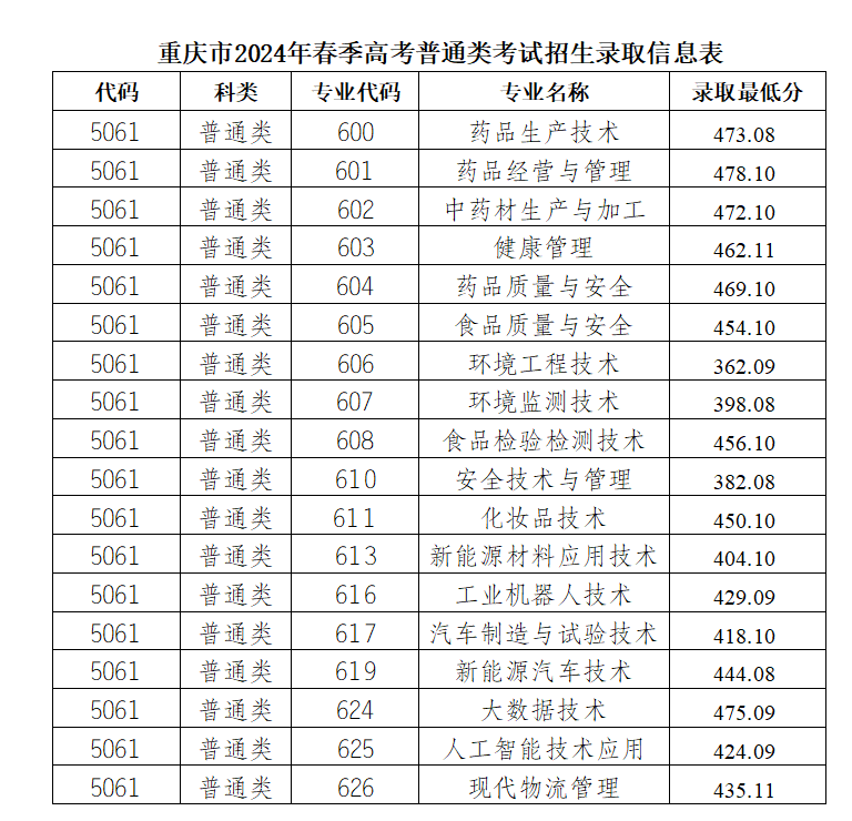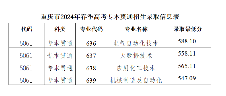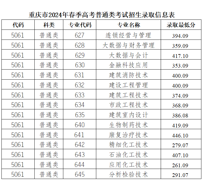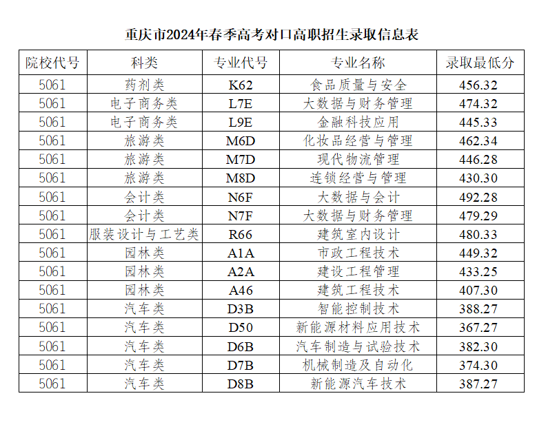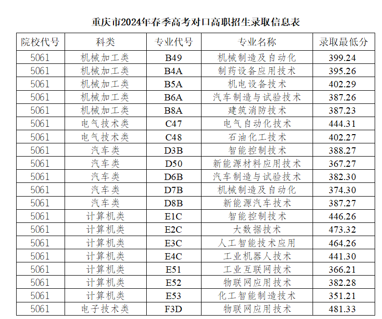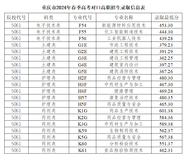 重庆化工职业学院2024年春季高考对口高职最低分及专业对应表