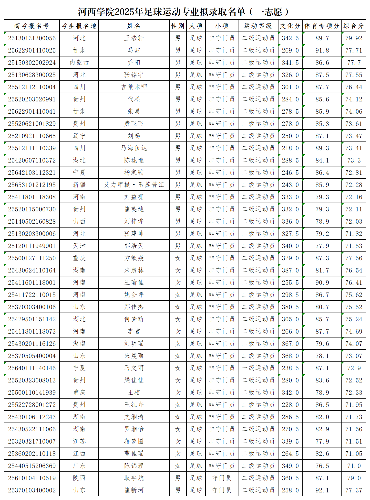 根据《2025年普通高等学校运动训练、武术与民族传统体育专业招生管理办法》《河西学院2025年足球运动专业招生简章》要求,我校2025年足球运动专业一志愿录取工作已结束,现将拟录取名单予以公示,公示期为2025年5月22日-26日。如对拟录取名单有异议,请于公示期内联系河西学院招生办,联系电话:09368283598。
