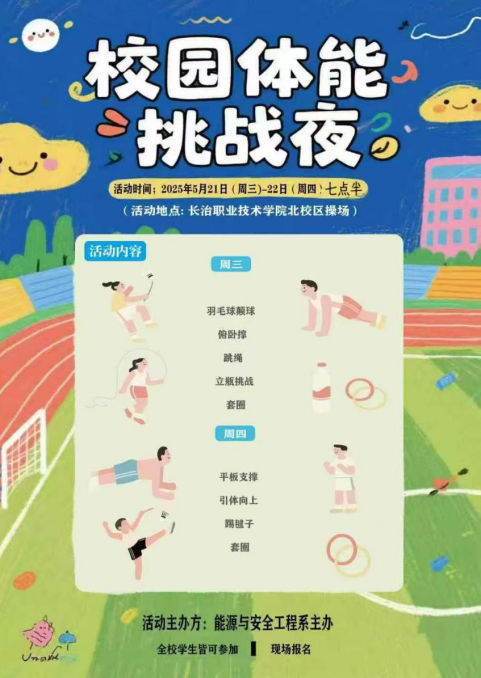 为积极响应全民健身号召,丰富师生校园文化活动,5月21日至22日,能源系于北校区操场举办“校园体能挑战夜”活动。活动设置了羽毛球颠球、平板支撑、引体向上、跳绳、套圈等八大趣味体能挑战项目,吸引众多师生热情参与,共同感受运动带来的乐趣。