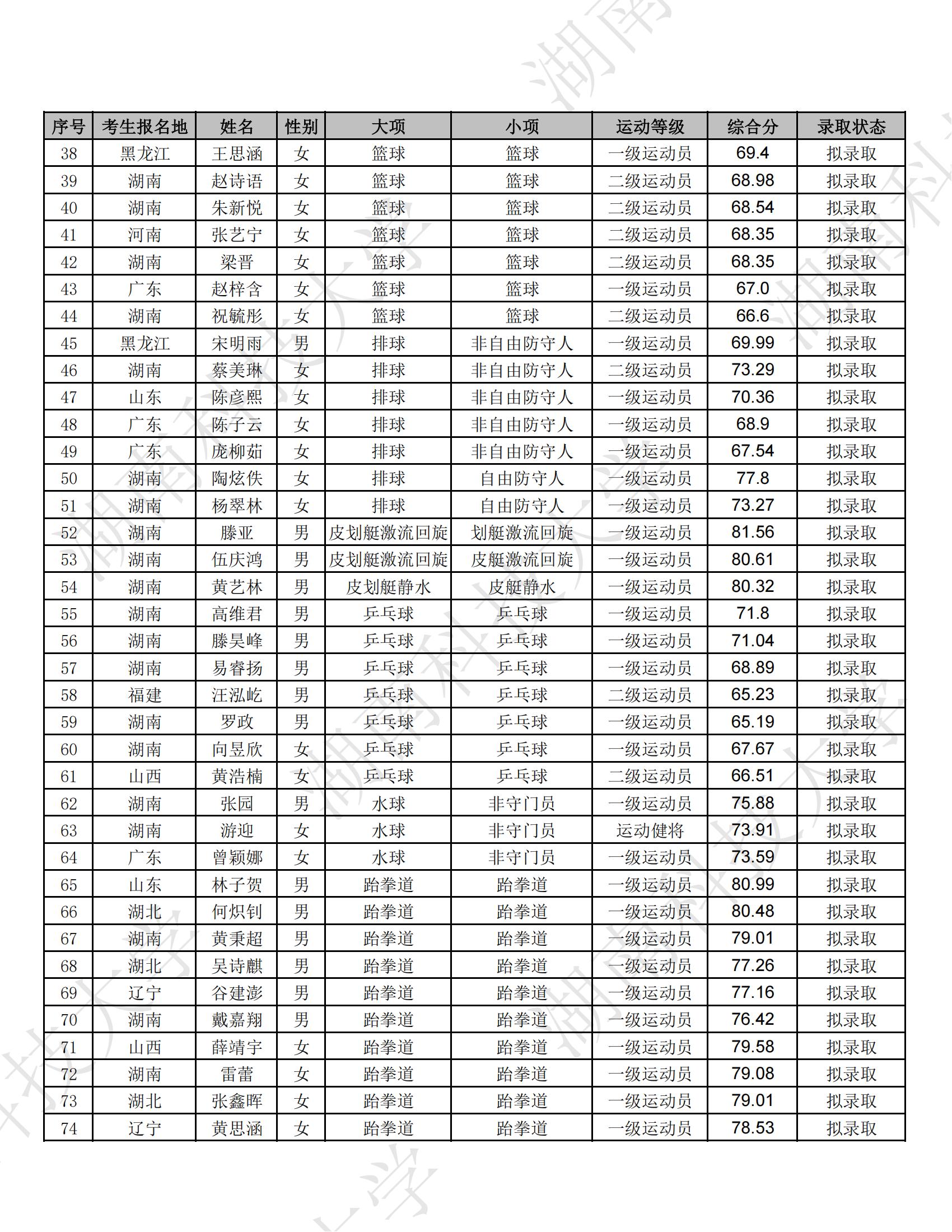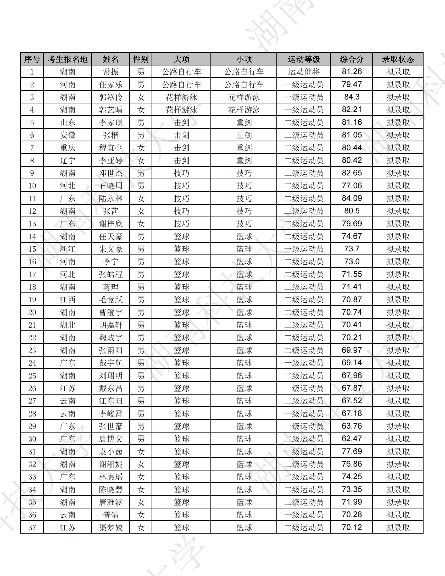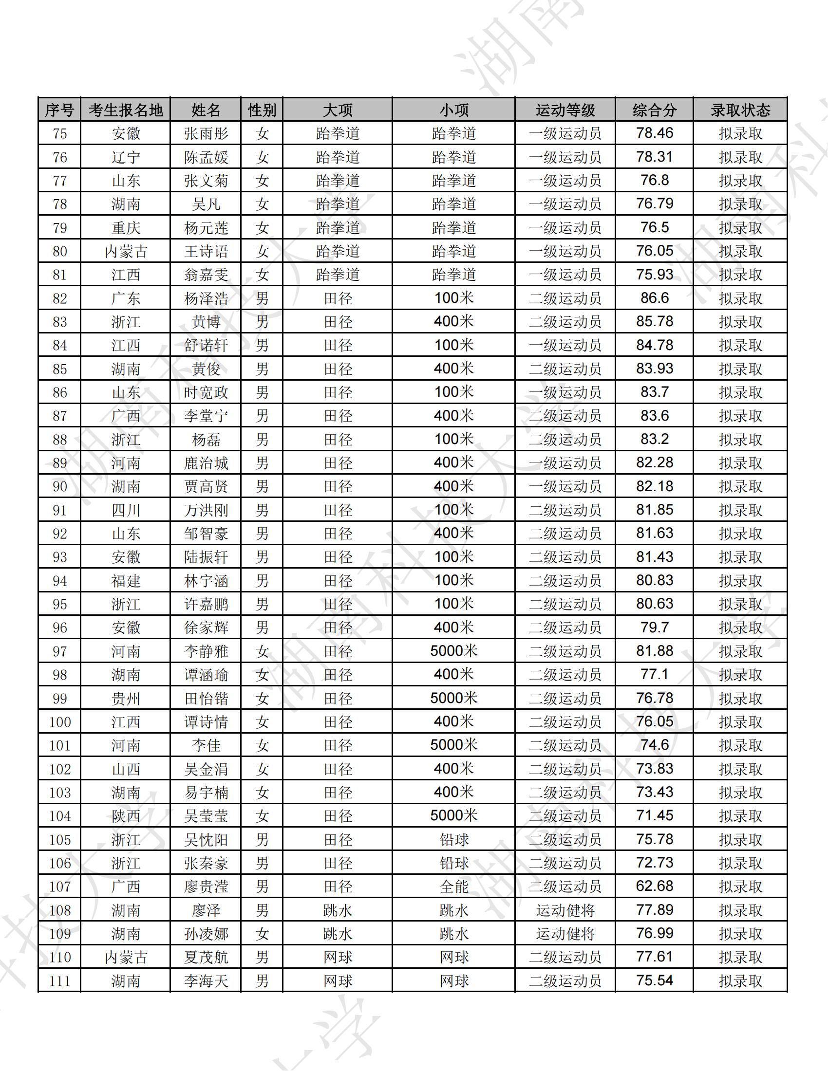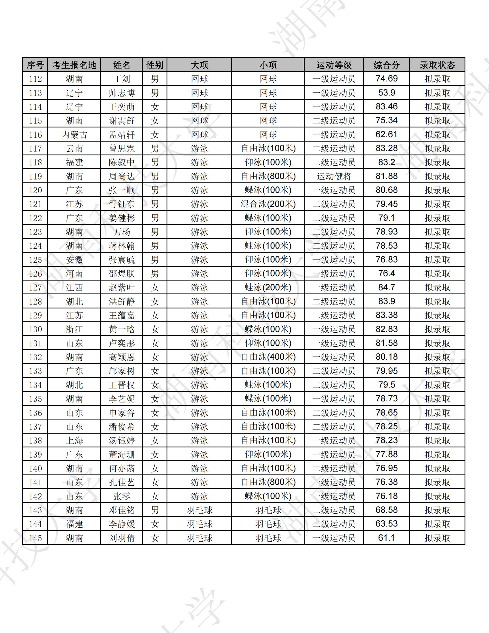 根据《2025年普通高等学校运动训练、武术与民族传统体育专业招生管理办法》(体科字〔2024〕256号)和《湖南科技大学2025年运动训练专业招生简章》等相关文件要求,拟录取符合条件的考生145人,现将拟录取名单予以公示,具体名单如下。