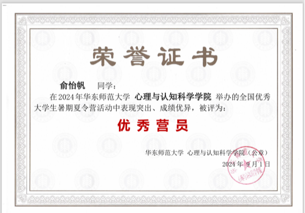 在这两所学府的学术之旅中,我收获满满。凭借在天津师范大学心理学部积累的扎实专业基础,我在两所夏令营中均脱颖而出,荣获 “优秀营员” 称号。这不仅是对我个人学习成果的高度认可,更是对天津师范大学心理学部卓越本科教育质量的有力印证,让我深感自豪,也更加坚定了我在心理学道路上继续前行的决心。
